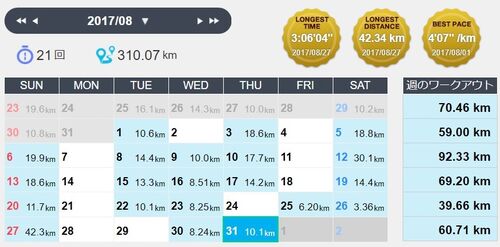 ■8月の総括 走行日数は21日、走行距離は310km。 目標の300kmはクリア。 30日・31日はキロ6~7のゆるジョグで特に記事なし。 ・参加レース 北海道マラソン3時間6分8秒(グロス) 理想の3時間、現実目標の3時間5分に届かず。 疲労抜…