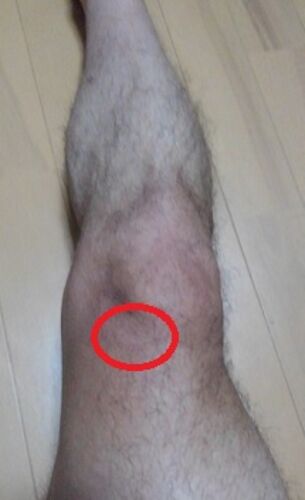火曜日に急に発症した右膝の上の痛み。 水曜、木曜で回復してきて、日常生活は何も感じなくなりました。 階段も問題なく昇降できるし、軽くて良かったとホッとしました。 痛くなったのは赤丸の部分。 見苦しいですが、今後のための記録として。 鵞足炎という…