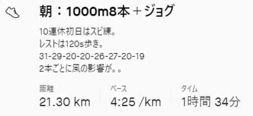 さて25日~3日まで10連休です。 最近走れてないので、少しでも取り戻すべく、 かつ、死なない程度に走りたいですね。 まずは1日目と2日目のラン。 ******** 12/25(金) 連休初日はスピ練です。 1000m8本。 行けるなら10本行き…