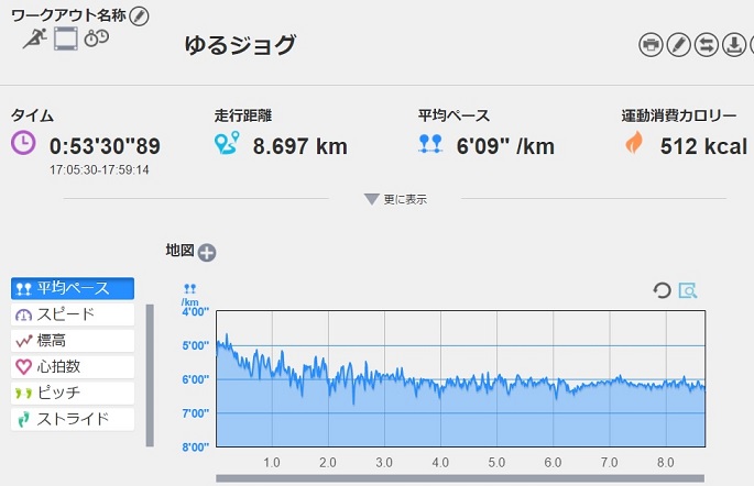 キロ6なのでゆるジョグだけど、自分のゆるジョグにしては速め。