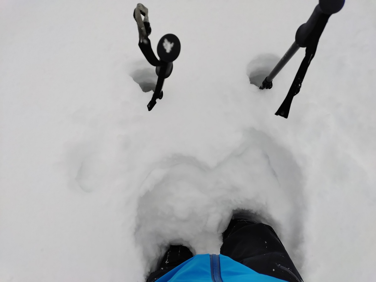 雪がもりもりの西側斜面を登ったのですが、ほかに誰も登っておらずラッセル祭り。
